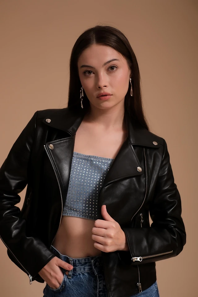 Furniq Uk Women's Cropped Leather Jacket With Gold Buttons, Created for Macy s