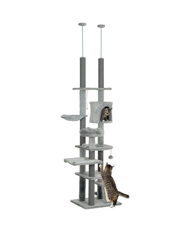 PawHut 89"-100" Floor to Ceiling Cat Tree with Cat Perch & Condo,