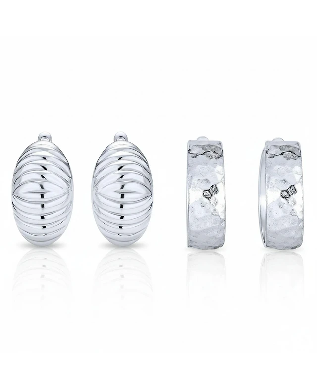 Bling Jewelry Set of 2 Polished Shrimp Dome and Matte Hammered Hoop Clip-On Earrings Sterling Silver