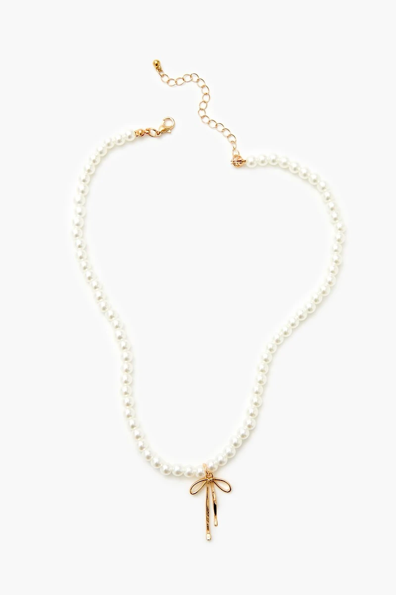 A high-polish necklace featuring faux pearl bead embellishments, a bow pendant, and lobster-clasp closure.Size + Fit