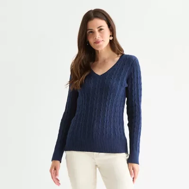 St. John's Bay Womens V Neck Long Sleeve Cable Knit Pullover Sweater