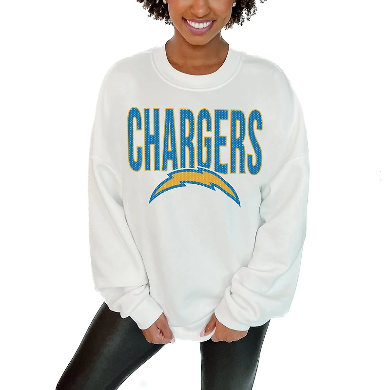 Embrace the spirit of the Los Angeles Chargers with this Just Go With It Oversized Long Sleeve Crewneck Sweatshirt from Gameday Couture. The dropped shoulder seams provide a relaxed fit for ease of movement, making it perfect for layering on game day or lounging at home. The screen print graphics boldly display your Los Angeles Chargers pride, letting everyone know who you're rooting for all season long.